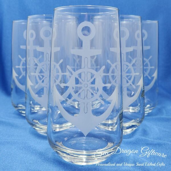 Each and every tall tumbler glass set that Sea Dragon Giftware creates is individually sand etched / carved / engraved using a sandblasting process.