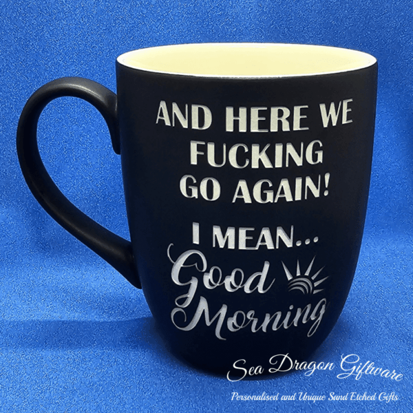 Each and every ceramic coffee/tea mug that Sea Dragon Giftware creates is individually sand etched / carved / engraved using a sandblasting process.