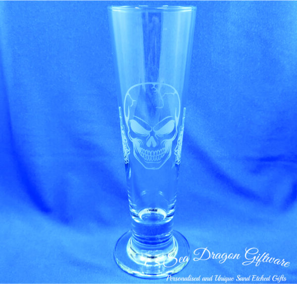 Each and every pilsner footed beer glass that Sea Dragon Giftware creates is individually sand etched / carved / engraved using a sandblasting process.