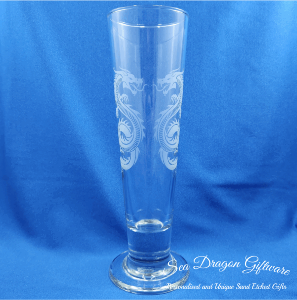 Each and every pilsner footed beer glass that Sea Dragon Giftware creates is individually sand etched / carved / engraved using a sandblasting process.
