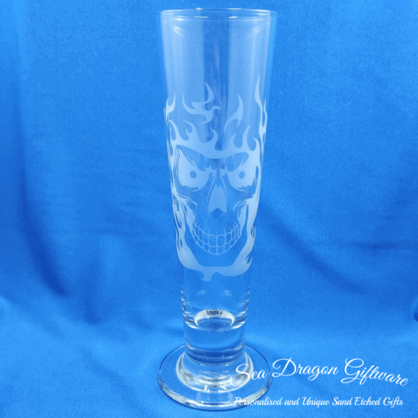 Each and every pilsner footed beer glass that Sea Dragon Giftware creates is individually sand etched / carved / engraved using a sandblasting process.