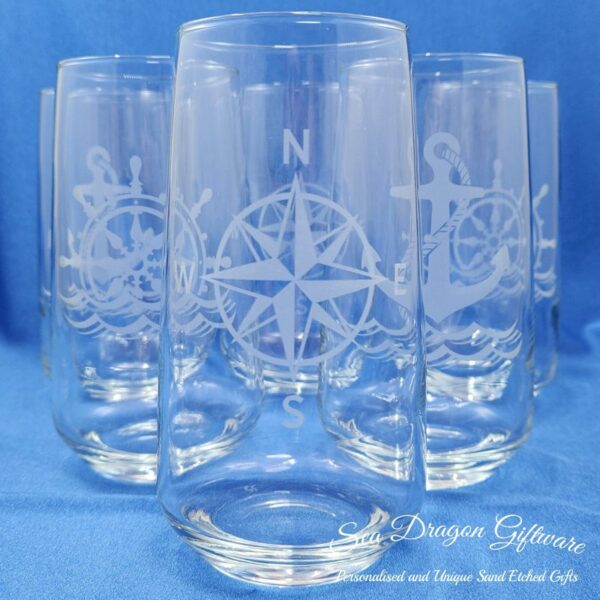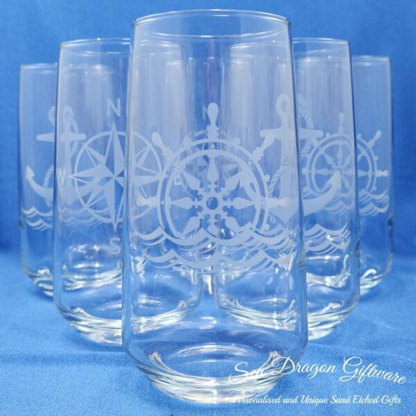 Each and every tall tumbler glass set #1 that Sea Dragon Giftware creates is individually sand etched / carved / engraved using a sandblasting process.