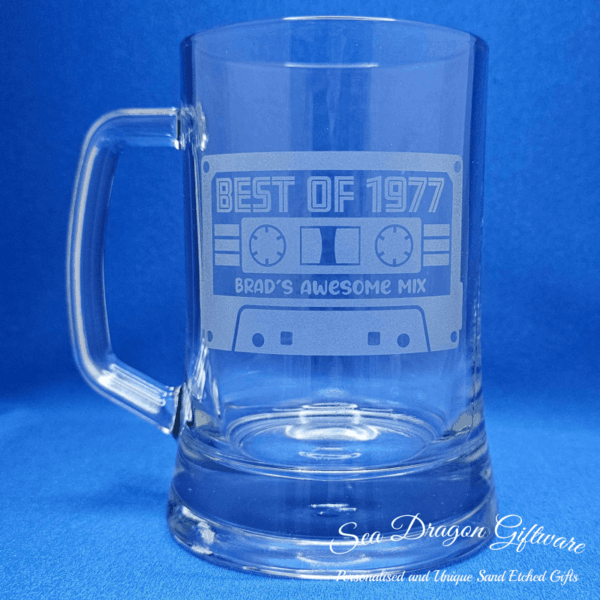 Personalised Cassette Tape Year & Name – Sand Etched/Engraved Beer Stein/Mug #1