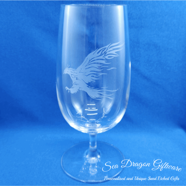 Each and every stemmed beer glass that Sea Dragon Giftware creates is individually sand etched / carved / engraved using a sandblasting process.