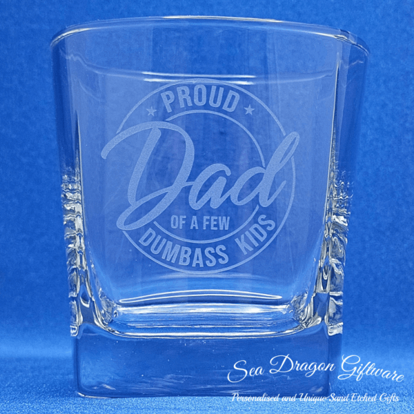 Proud Dad Of A Few Dumbass Kids – Sand Etched/Engraved Quartet Spirit Glass