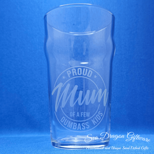 Proud Mum Of A Few Dumbass Kids – Sand Etched/Engraved Pint Beer Glass (Nonic)