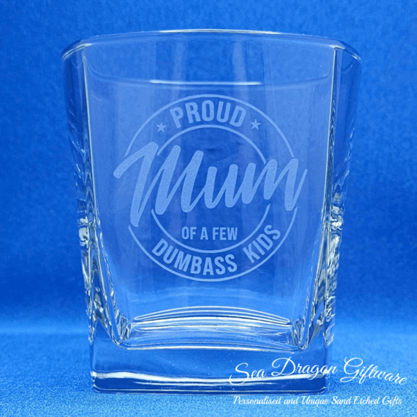 Proud Mum Of A Few Dumbass Kids – Sand Etched/Engraved Quartet Spirit Glass