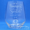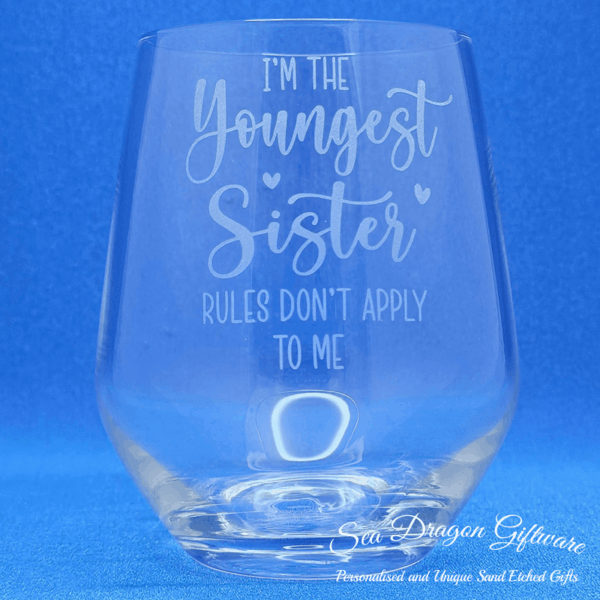 Sister #3 – I’m the youngest sister rules don’t apply to me – Sand Etched/Engraved Stemless Wine Glass