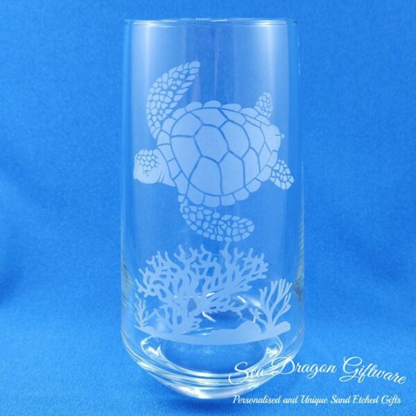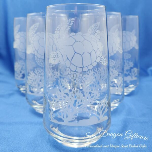 Each and every tall tumbler glass set #1 that Sea Dragon Giftware creates is individually sand etched / carved / engraved using a sandblasting process.