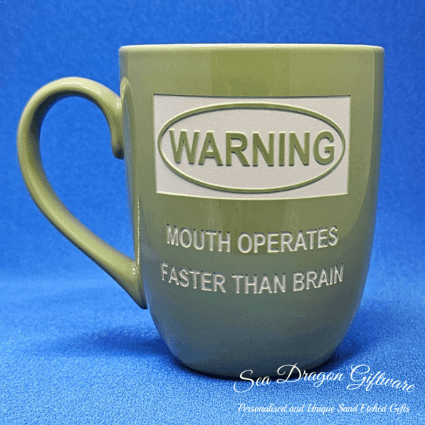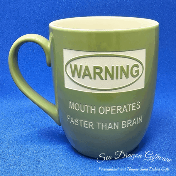 Each and every ceramic coffee/tea mug that Sea Dragon Giftware creates is individually sand etched / carved / engraved using a sandblasting process.