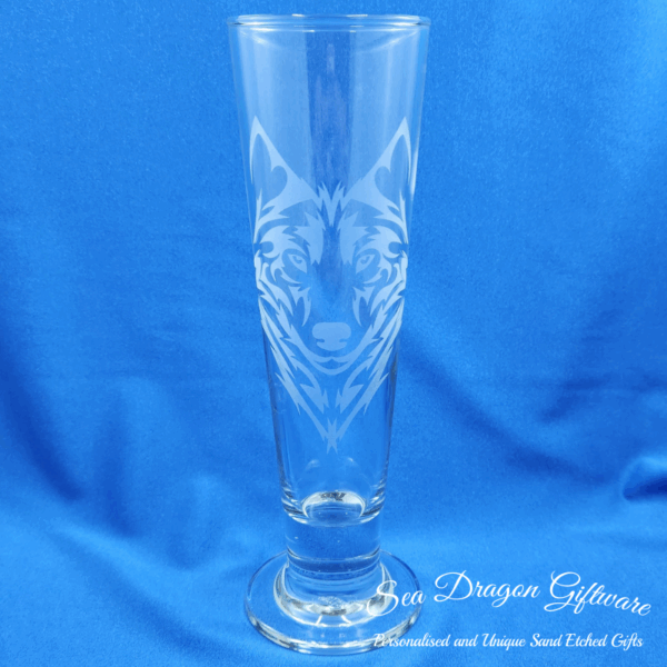 Each and every pilsner footed beer glass that Sea Dragon Giftware creates is individually sand etched / carved / engraved using a sandblasting process.